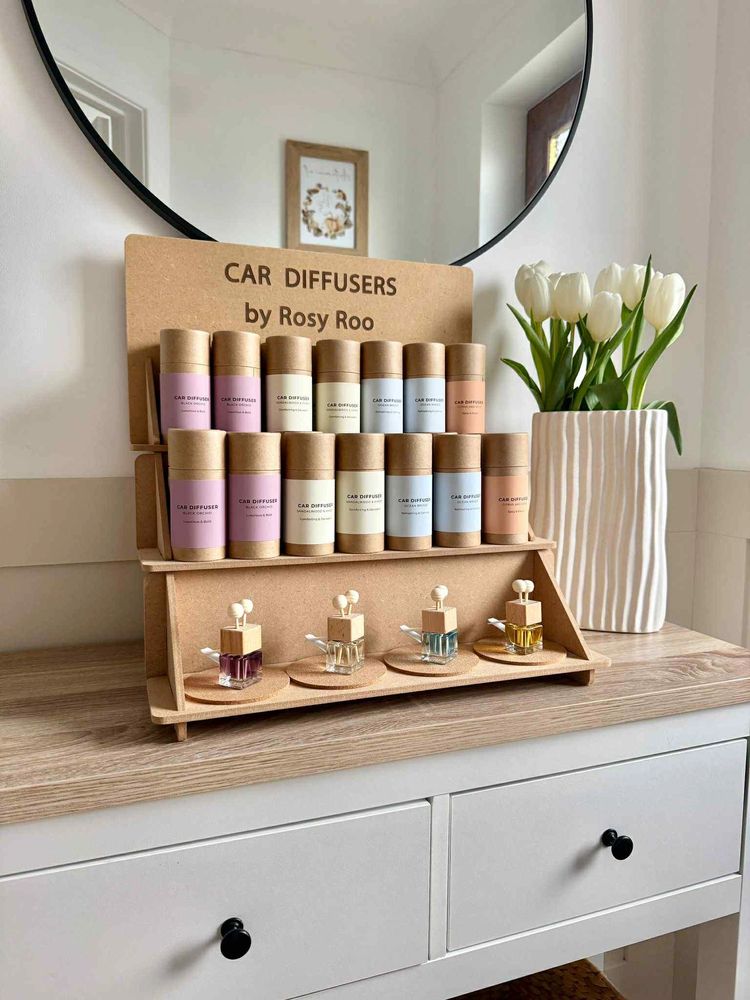 Each car diffuser comes with a metal clip you twist between the lid and the bottle allowing you to securely clip the diffuser onto your air vent.